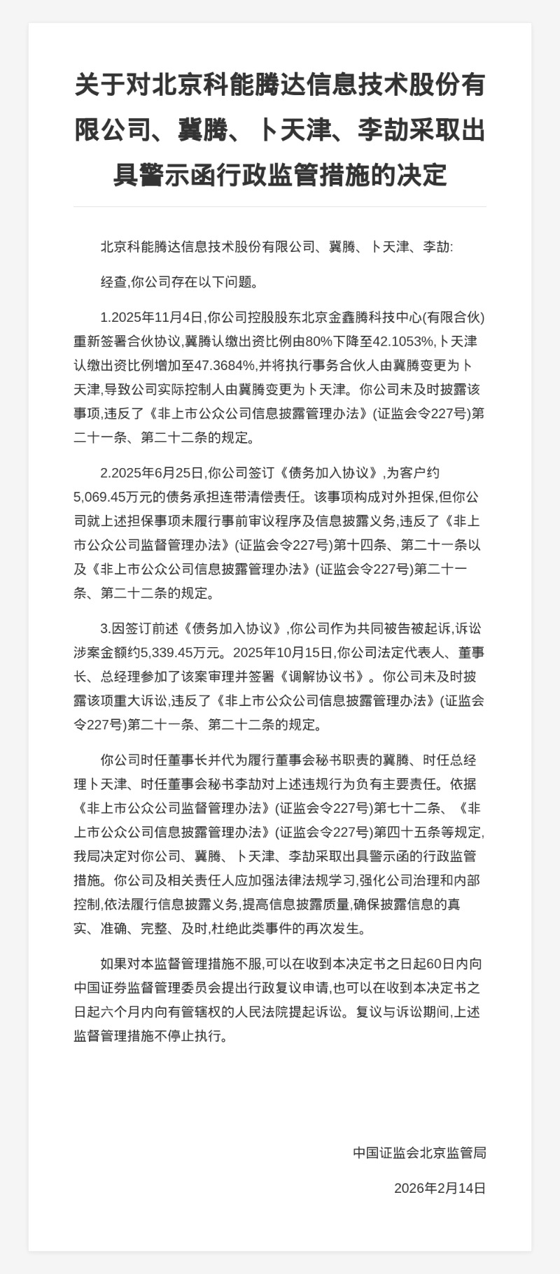 对此,中国证监会北京监管局决定对北京科能腾达信息技术股份有限公司、冀腾、卜天津、李劼采取出具警示函的行政监管措施。
