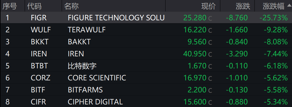 恐慌情绪还蔓延至传统金融市场。当前,美股区块链概念股全线走低。其中,运营区块链房屋贷款、同时运营加密货币交易所的初创公司Figure Technology Solutions跌超25%,比特币矿企 TeraWulf 跌近10%、Bitfarms跌超5%,加密货币交易平台Bakkt跌超8%。
