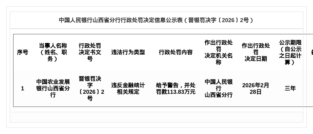 农发行山西省分行被罚113.83万,涉违反金融统计规定