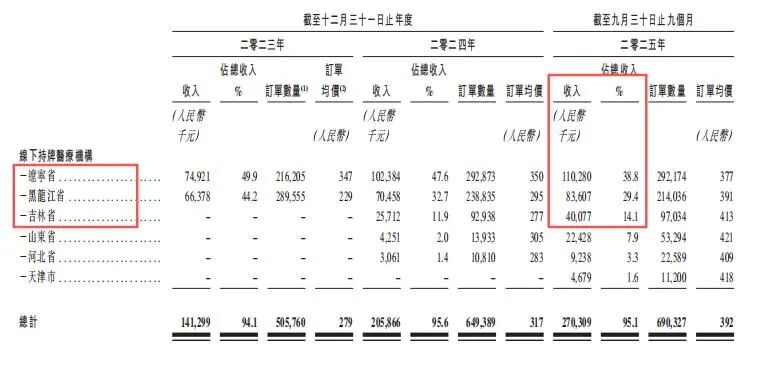 但细看其收入结构,会发现其中的风险点:誉研堂的基本盘,仍被牢牢锁定在“山海关”以外。2025年前9个月,辽宁省贡献了29.4%的线下收入,黑龙江省贡献了14.1%。这意味着,这家号称“中国领先”的中医集团,本质上仍是一家区域型连锁机构。