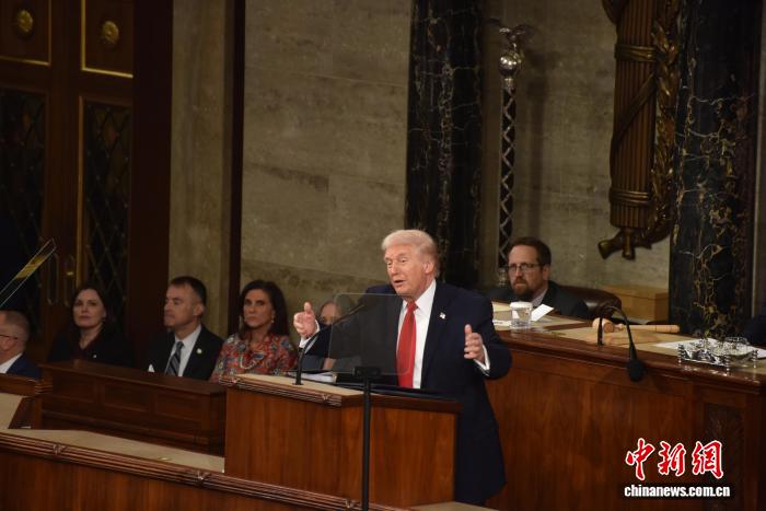 当地时间2月24日晚,美国总统特朗普在国会参众两院联席会议上发表国情咨文讲话,聚焦经济、移民等议题。这是特朗普在本总统任期内首次发表国情咨文。中新社记者沙晗汀摄