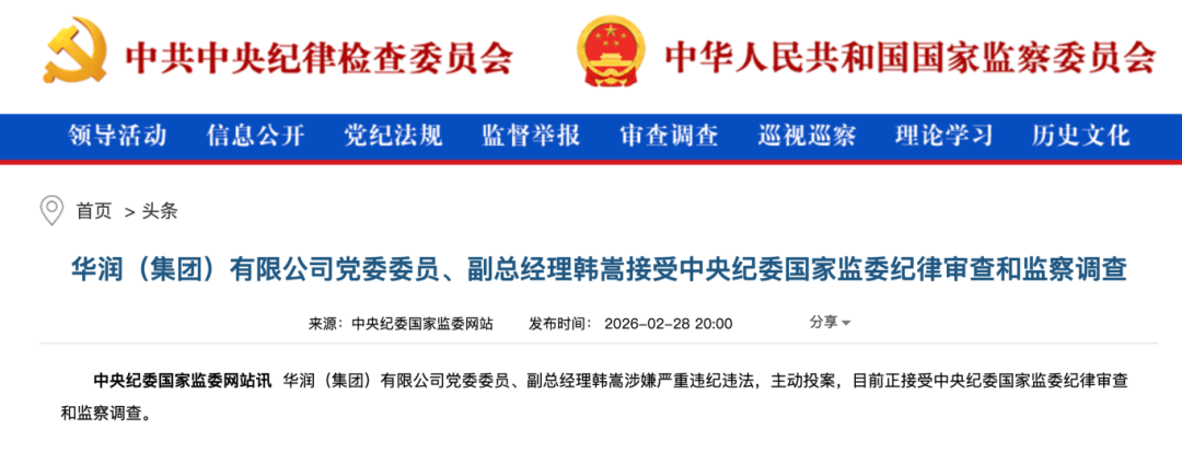 据中央纪委国家监委网站消息,华润(集团)有限公司党委委员、副总经理韩嵩涉嫌严重违纪违法,主动投案,目前正接受中央纪委国家监委纪律审查和监察调查。