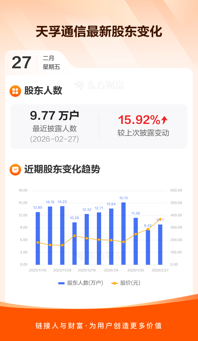 天孚通信:截至2月27日最新股东户数9.77万户,较上期增加15.92%