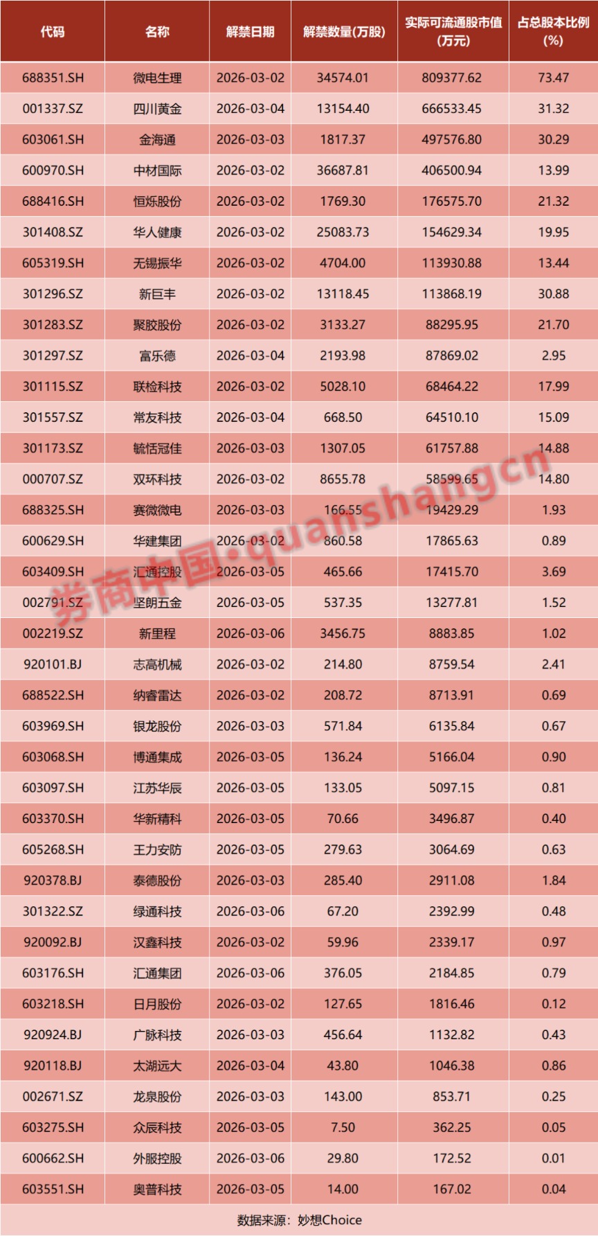 从解禁占比来看,解禁占比居前三位的是:微电生理(73.47%)、四川黄金(31.32%)、新巨丰(30.88%)。