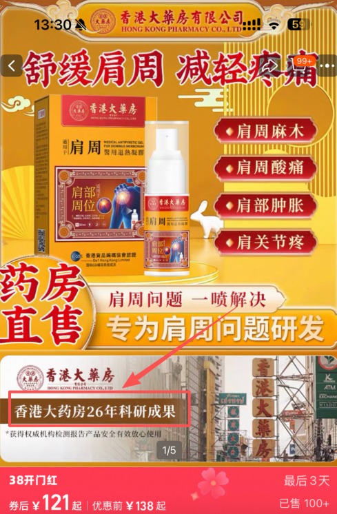 蓝鲸记者查询发现,此类网店频繁使用“国货之光”“百年历史”等宣传字样,甚至有商品详情页标注“香港大药房26年科研成果”,刻意营造一种深耕行业的厚重感。