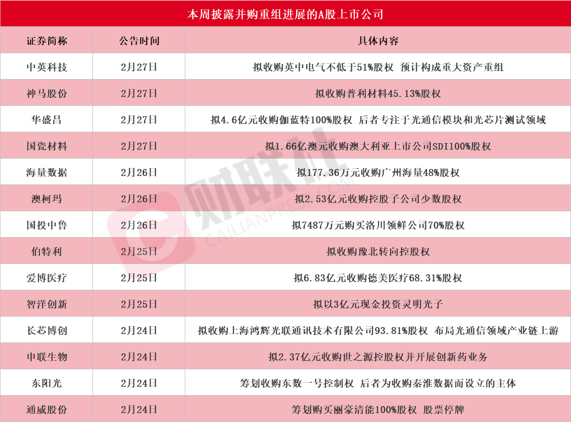 据不完全统计,截至发稿,本周(2月24日-3月1日)包括中英科技、神马股份、华盛昌、国瓷材料、海量数据、澳柯玛、国投中鲁、伯特利、爱博医疗、智洋创新、长芯博创、申联生物、东阳光、通威股份在内的14家A股上市公司披露并购重组进展最新公告。其中,中英科技公告,拟收购英中电气不低于51%股权,预计构成重大资产重组。