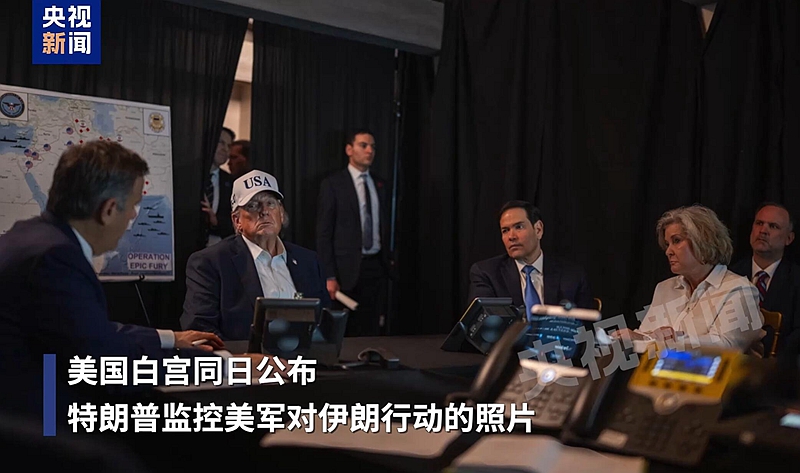 上述两张图为美军公布对伊朗行动视频,特朗普监控行动照片曝光。(来源:央视新闻)