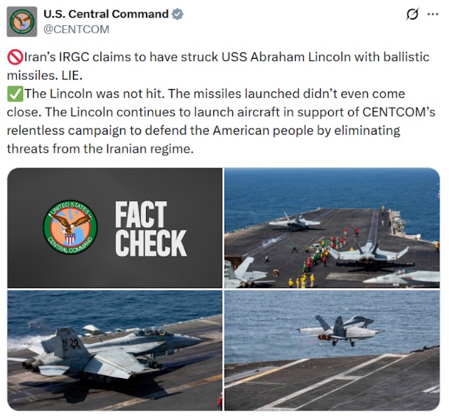 美国中央司令部在X网站上发帖称,美国军舰“林肯”号仍在继续起飞飞机。“林肯”号是美军部署到该地区的两艘航空母舰之一。
