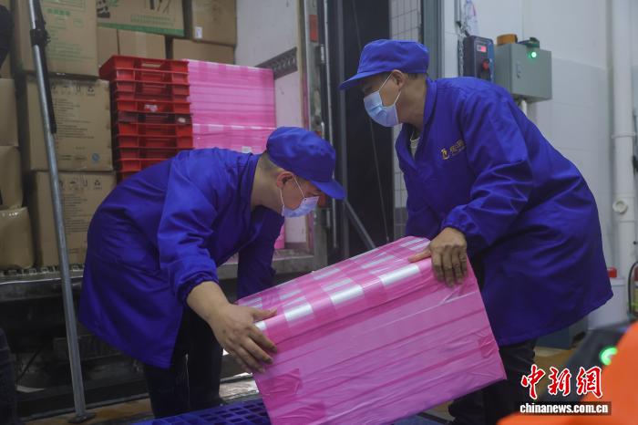 图为海南椰乡源食品有限公司工人搬运加工好的文昌鸡。中新网记者骆云飞摄