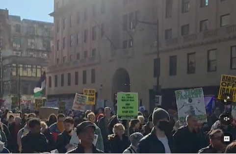 △纽约时代广场当天发生反战集会,抗议美以联合对伊朗发动军事打击