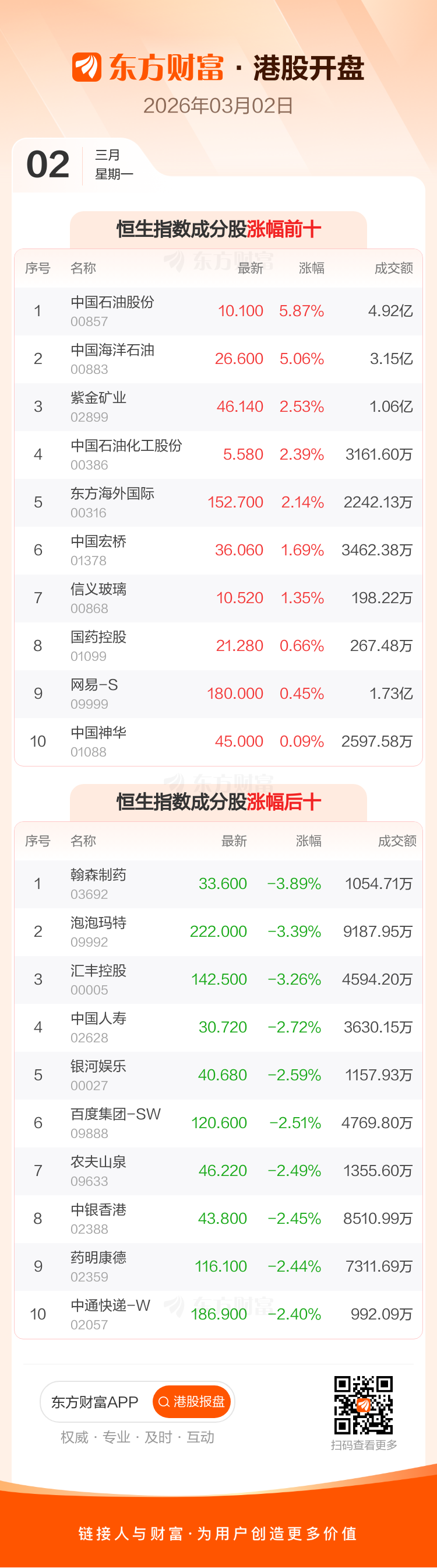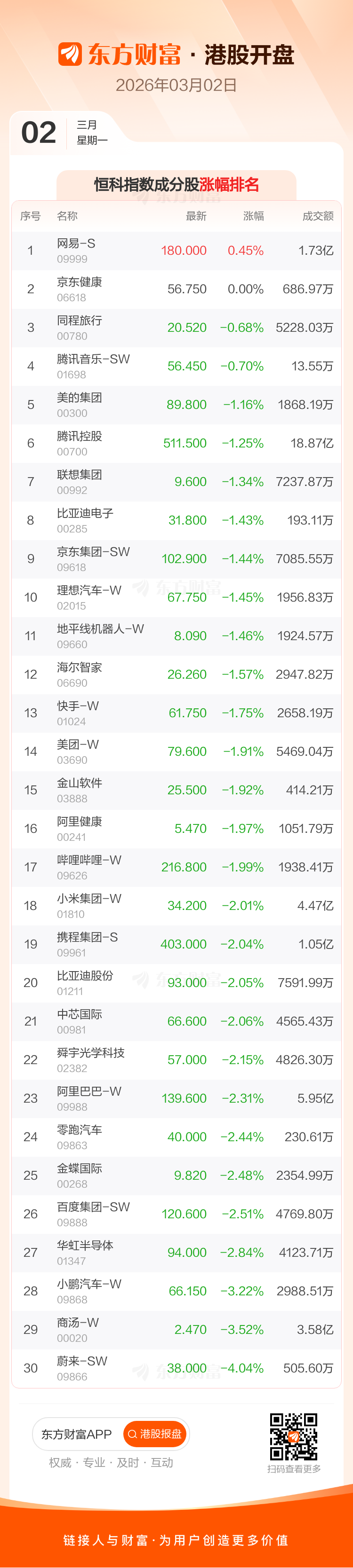 港股3月2日低开,恒生指数开盘报26305.58点,跌324.96点,跌幅1.22%;恒生科技指数开盘报5046.4点,跌91.44点,跌幅1.78%。恒生指数成分股中中国石油股份、中国海洋石油、紫金矿业涨幅居前,翰森制药、泡泡玛特、汇丰控股跌幅靠前。恒生科技指数成分股中网易-S、京东健康、同程旅行涨幅居前,蔚来-SW、商汤-W、小鹏汽车-W跌幅靠前。