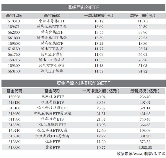 中韩半导体ETF上周上涨18.12%,领涨全市场ETF,周换手率高达413.07%。