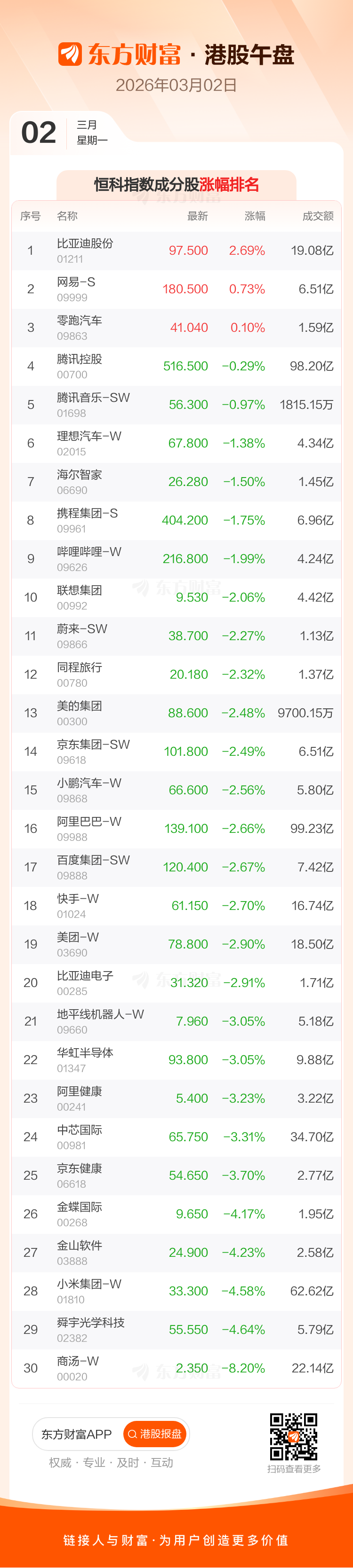 港股3月2日午盘走低,恒生指数收报26209.91点,跌420.63点,跌幅1.58%;恒生科技指数收报5030.11点,跌107.73点,跌幅2.1%。恒生指数成分股中信义玻璃、中国宏桥、中国海洋石油涨幅居前,舜宇光学科技、小米集团-W、中银香港跌幅靠前。恒生科技指数成分股中比亚迪股份、网易-S、零跑汽车涨幅居前,商汤-W、舜宇光学科技、小米集团-W跌幅靠前。