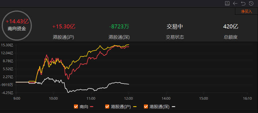 资金方面,南向资金早盘净买入14.43亿港元。