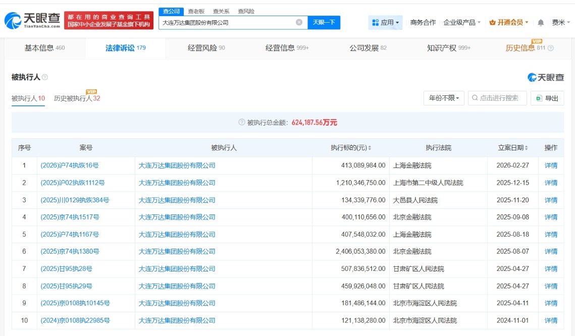 【大河财立方消息】天眼查法律诉讼信息显示,近日,大连万达集团股份有限公司、万达地产集团有限公司等新增1条恢复执行信息,执行标的4.1亿余元,执行法院为上海金融法院。