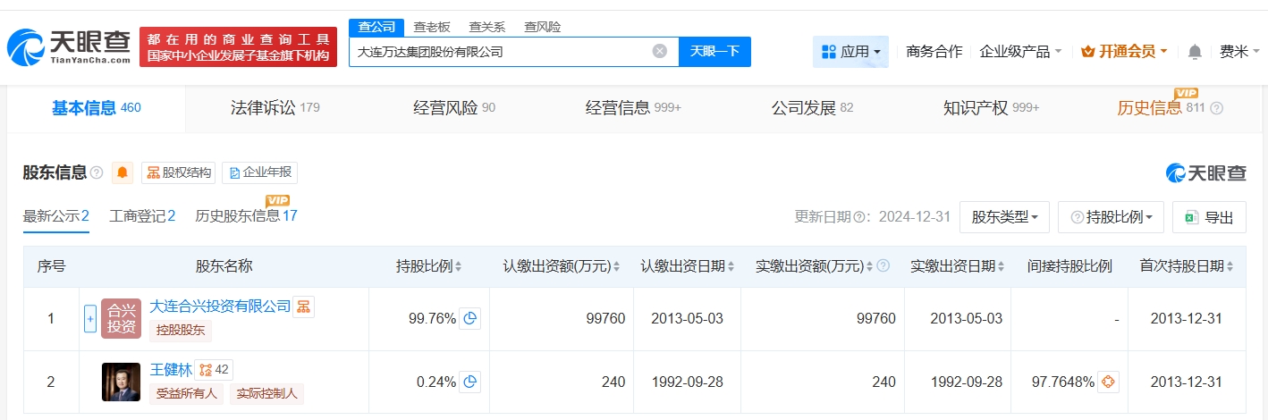 股东信息显示,大连万达集团由大连合兴投资有限公司、王健林共同持股。天眼风险信息显示,该公司现存10条被执行人信息,被执行总金额超62亿元。