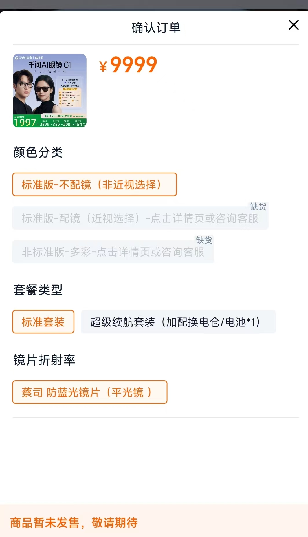 天猫的商品页面信息显示,该产品针对非近视人群和近视人群分别推出“标准版-不配镜”“标准版-配镜”规格,另有“非标准版-多彩”规格;套餐类型则分为标准套装与超级续航套装(加配换电仓/电池*1)。