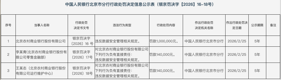 2月28日,中国人民银行北京市分行公布的行政处罚决定信息显示,北京农村商业银行股份有限公司(下称“北京农商银行”)因违反数据安全管理相关规定被罚款100万元。与此同时,该行零售金融部李某青、运行维护中心王某志因负有直接责任,分别被罚款14万元。