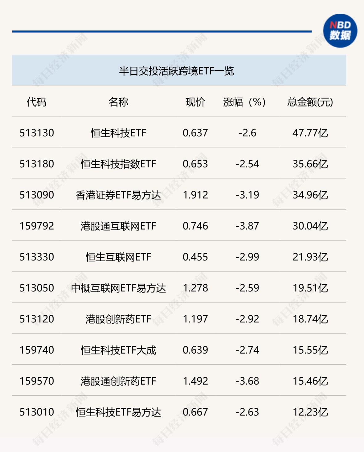 今日上午,卫星、石油、电网设备、有色金属等相关ETF纷纷放量,其中,卫星ETF(159206)半日成交金额达到20亿元;跨境ETF方面,恒生科技ETF(513130)半日成交金额达到47.77亿元,近50亿元。