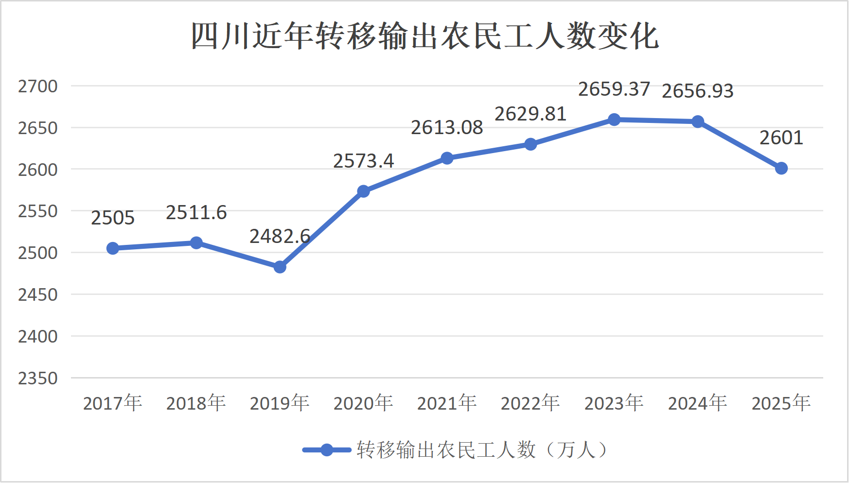 公报显示,2023年,四川全省共转移输出农村劳动力2659.37万人,比上年末增加29.56万人;2024年,全省转移输出农村劳动力2656.93万人,比上年末减少2.44万人。根据此次发布的数据,2025年在2024年基础上减少了55.93万人。