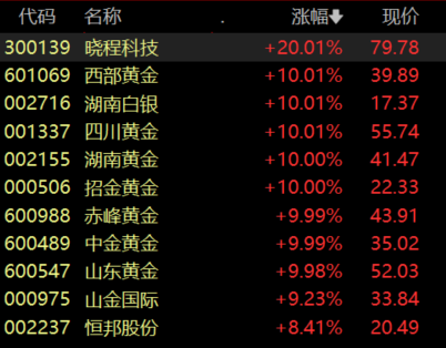 贵金属板块走高,晓程科技、西部黄金、湖南白银、四川黄金等股涨停。