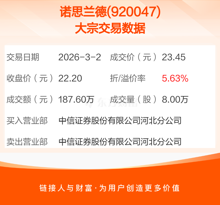 2026年3月2日,诺思兰德发生1笔大宗交易,共成交8.00万股,成交金额187.60万元,占其流通市值比例为0.05%。