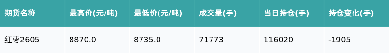 南财智讯3月2日电,盘后期货数据显示,郑州商品交易所的红枣主力合约收涨0.06%,收盘报8840.0元/吨,日内资金流出931.89万元。其他相关指标见下表: