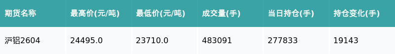 南财智讯3月2日电,盘后期货数据显示,上海期货交易所的沪铝主力合约收涨3.21%,收盘报24465.0元/吨,日内资金流入7.58亿元。其他相关指标见下表: