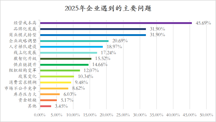 在经营痛点方面,成本高企成为深圳零售企业的最大挑战。2025年,45.69% 的企业将其列为首要问题,且覆盖各规模企业,其中年营收 10 亿元以上的集团公司受影响更为突出。此外,品牌化发展、商业模式转型成为企业普遍面临的难题。