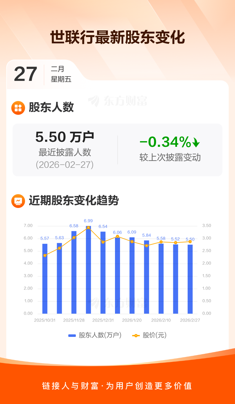 世联行最新披露数据显示,截至2月27日公司股东户数为5.50万户,较上期(2026年2月13日)减少188户,降幅为0.34%。户均持有流通股数量由上期的3.58万股上升至3.59万股,户均持股金额由上期的10.13万元增加至10.31万元。