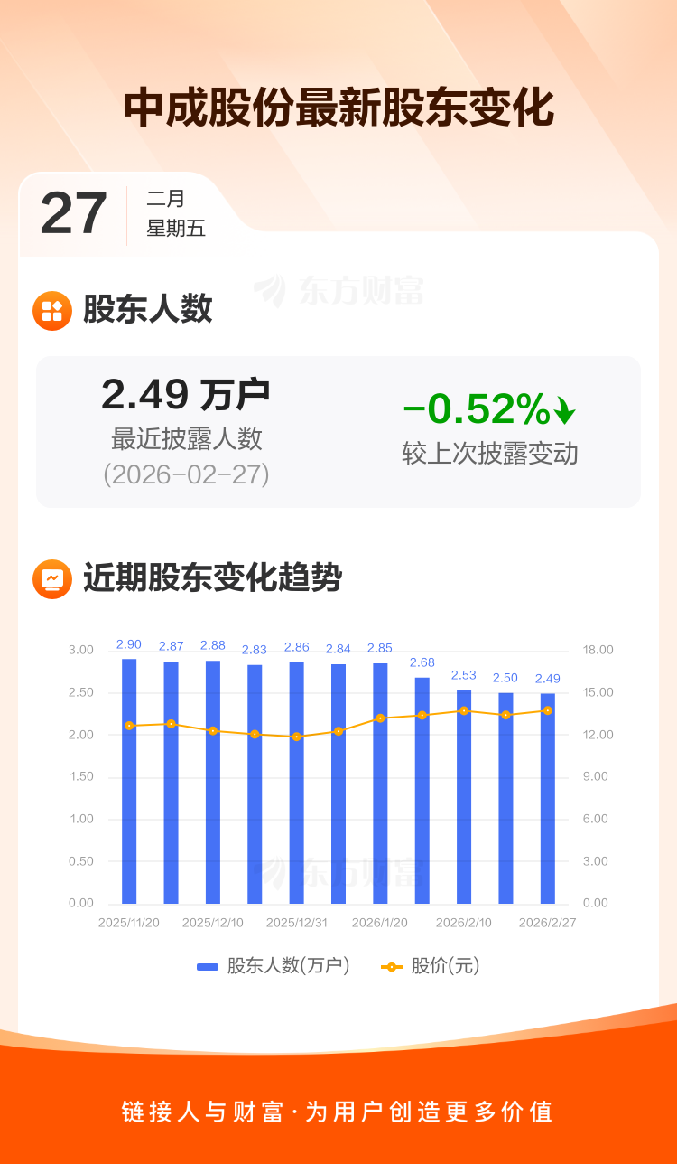 中成股份最新披露数据显示,截至2月27日公司股东户数为2.49万户,较上期(2026年2月13日)减少131户,降幅为0.52%。户均持有流通股数量由上期的1.23万股上升至1.24万股,户均持股金额由上期的16.50万元增加至16.99万元。