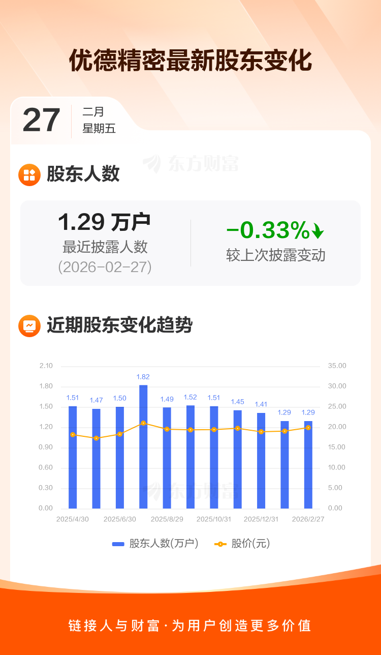 优德精密:截至2月27日最新股东户数1.29万户,较上期减少0.33%