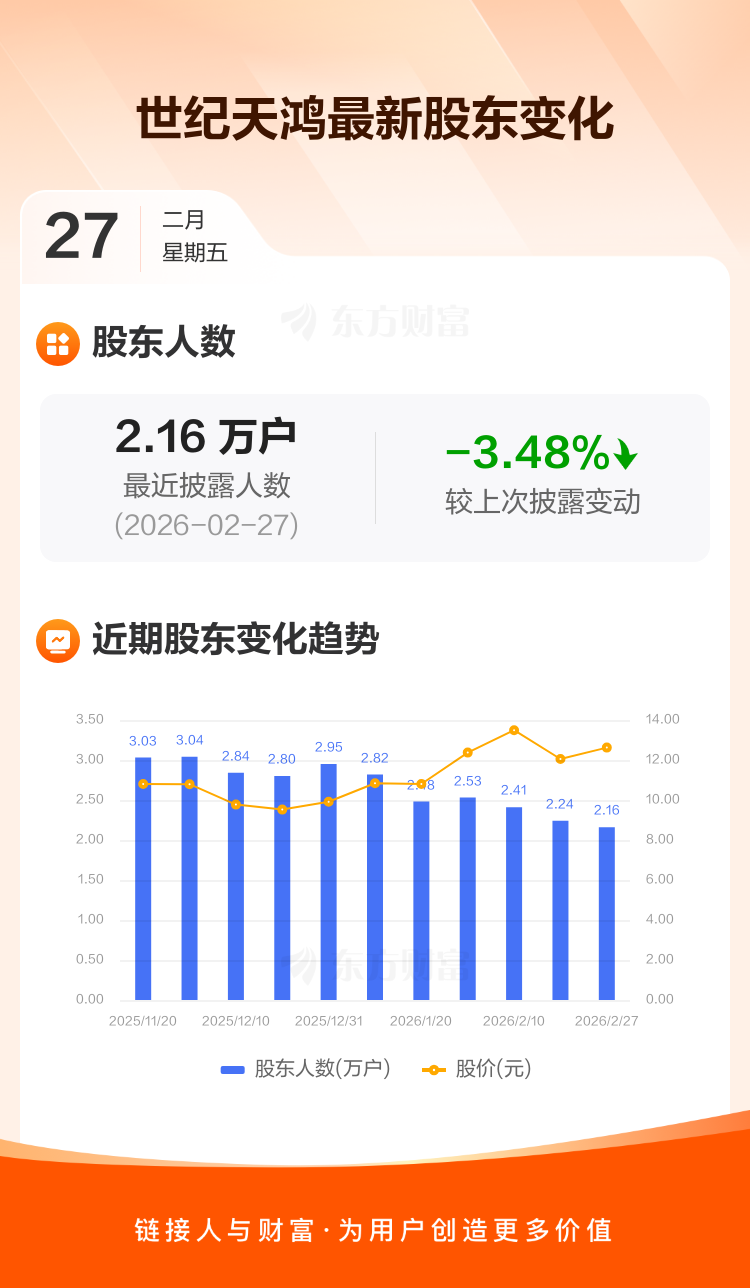 世纪天鸿最新披露数据显示,截至2月27日公司股东户数为2.16万户,较上期(2026年2月13日)减少780户,降幅为3.48%。户均持有流通股数量由上期的1.57万股上升至1.63万股,户均持股金额由上期的18.93万元增加至20.54万元。
