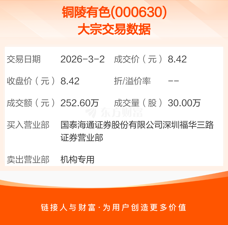 2026年3月2日,铜陵有色发生1笔大宗交易,共成交30.00万股,成交金额252.60万元。