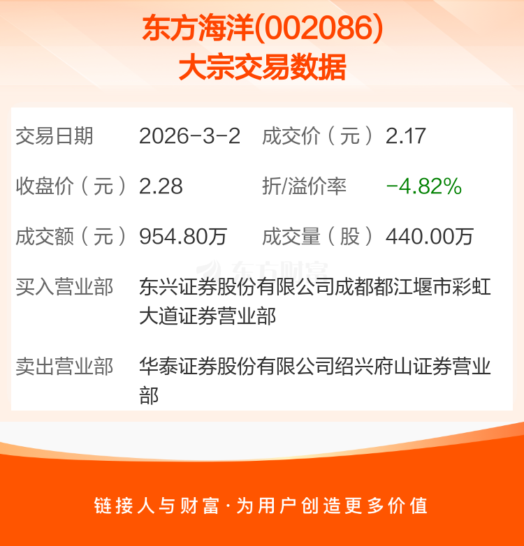 2026年3月2日,东方海洋发生1笔大宗交易,共成交440.00万股,成交金额954.80万元,占其流通市值比例为0.26%。