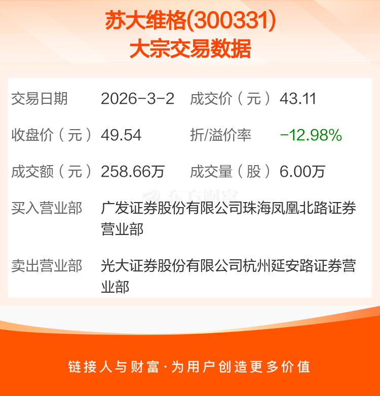 2026年3月2日,苏大维格发生1笔大宗交易,共成交6.00万股,成交金额258.66万元,占其流通市值比例为0.02%。