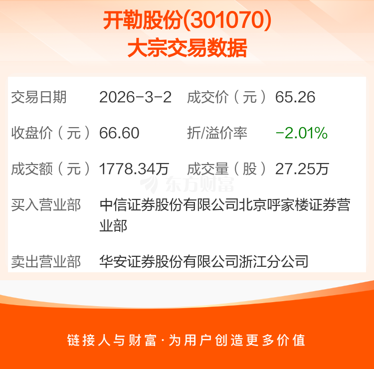 2026年3月2日,开勒股份发生1笔大宗交易,共成交27.25万股,成交金额1778.34万元,占其流通市值比例为0.45%。