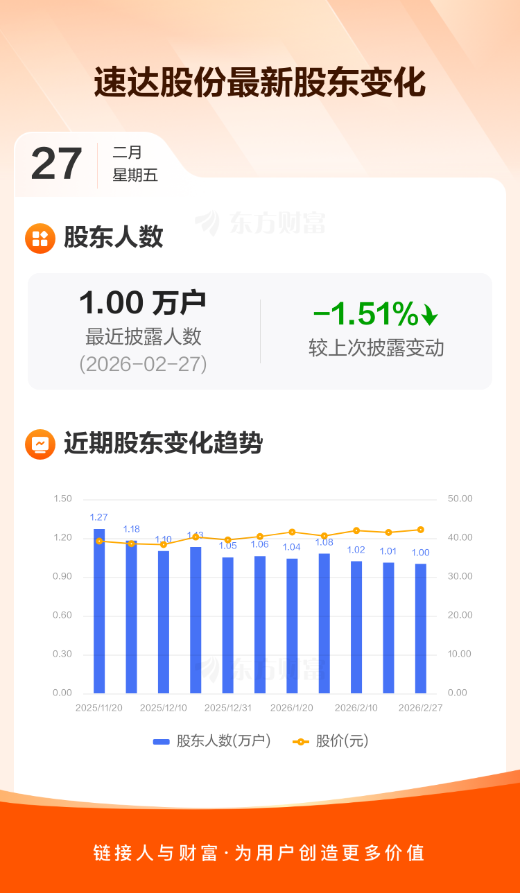 速达股份:截至2月27日最新股东户数9997户,较上期减少1.51%