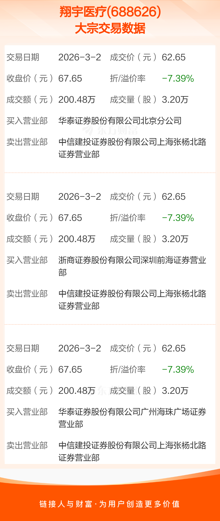 2026年3月2日,翔宇医疗发生3笔大宗交易,共成交9.60万股,成交金额601.44万元,占其流通市值比例为0.06%。