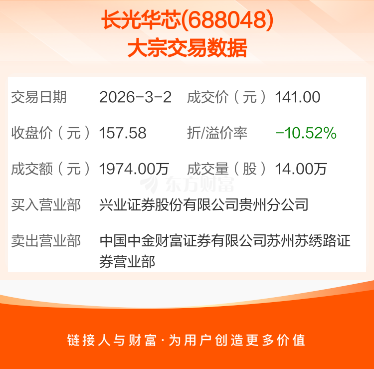 2026年3月2日,长光华芯发生1笔大宗交易,共成交14.00万股,成交金额1974.00万元,占其流通市值比例为0.07%。