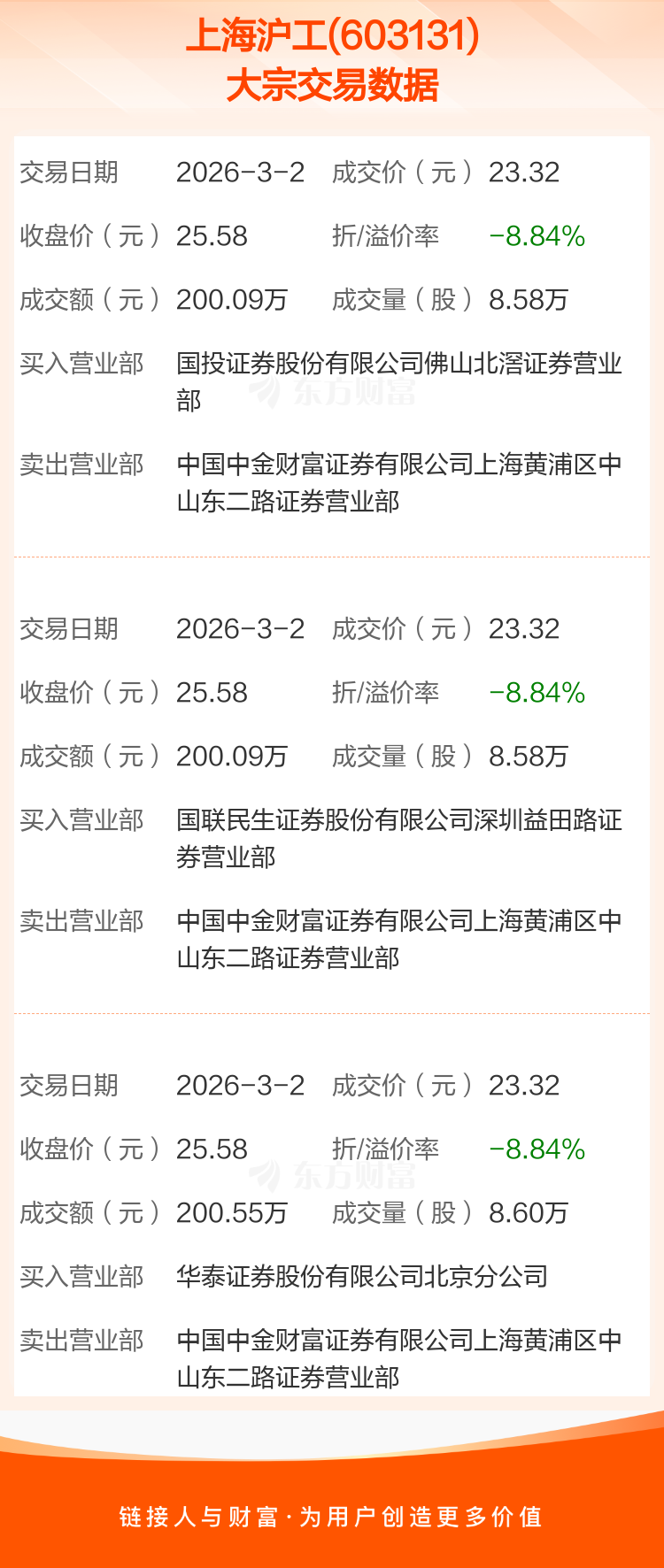 大宗交易:上海沪工成交600.73万元,折价8.83%(3-2)