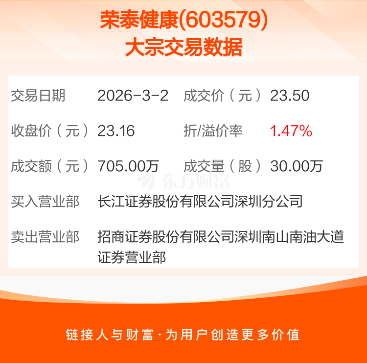 2026年3月2日,荣泰健康发生1笔大宗交易,共成交30.00万股,成交金额705.00万元,占其流通市值比例为0.15%。