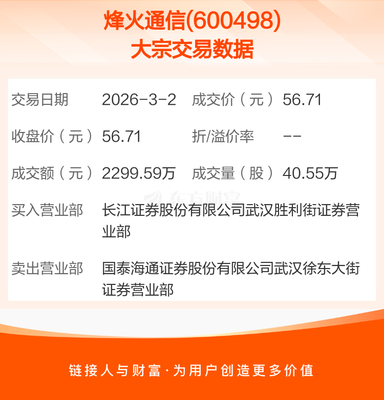 2026年3月2日,烽火通信发生1笔大宗交易,共成交40.55万股,成交金额2299.59万元,占其流通市值比例为0.03%。