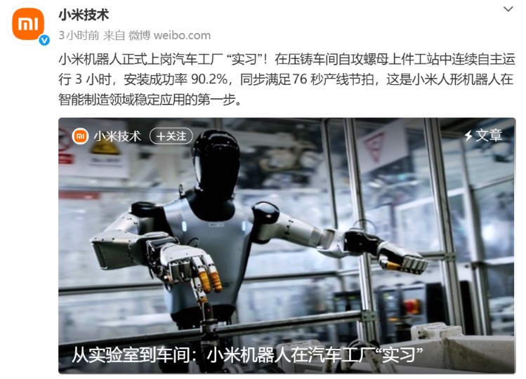 同在3月2日,“小米技术”发文称,小米机器人正式上岗汽车工厂“实习”,在压铸车间自攻螺母上件工站中连续自主运行3小时,安装成功率达90.2%,同步满足76秒产线节拍。小米技术称,这是小米人形机器人在智能制造领域稳定应用的第一步。