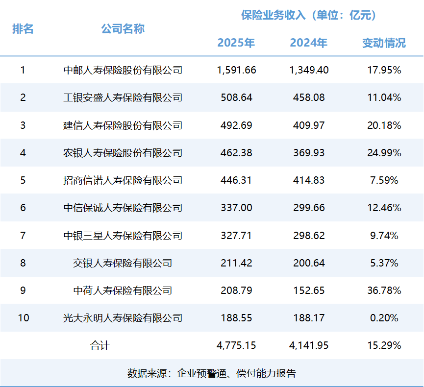 2025年,银行系寿险公司保险业务收入整体实现较快增长,合计收入4775.15亿元,较2024年的4141.95亿元大幅增长15.29%。这一增速高于寿险行业整体水平,根据金管总局数据,2025年人身险公司原保险保费收入4.36万亿元,同比增长8.91%。其中寿险业务收入3.56万亿元,同比增长11.4%。