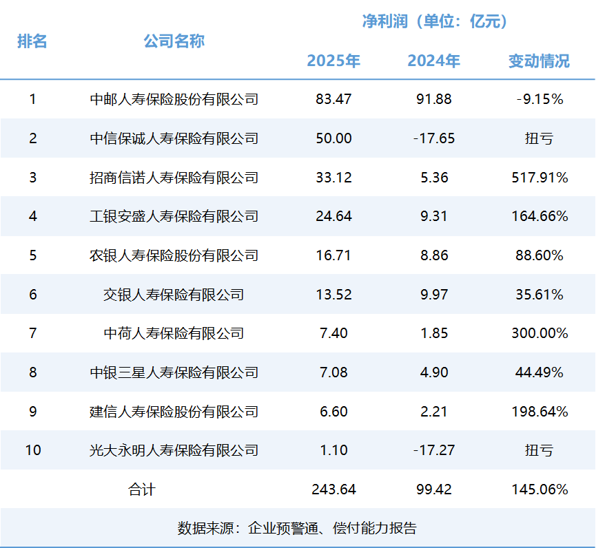 值得特别关注的是,2025年已披露数据的银行系寿险公司无一亏损。