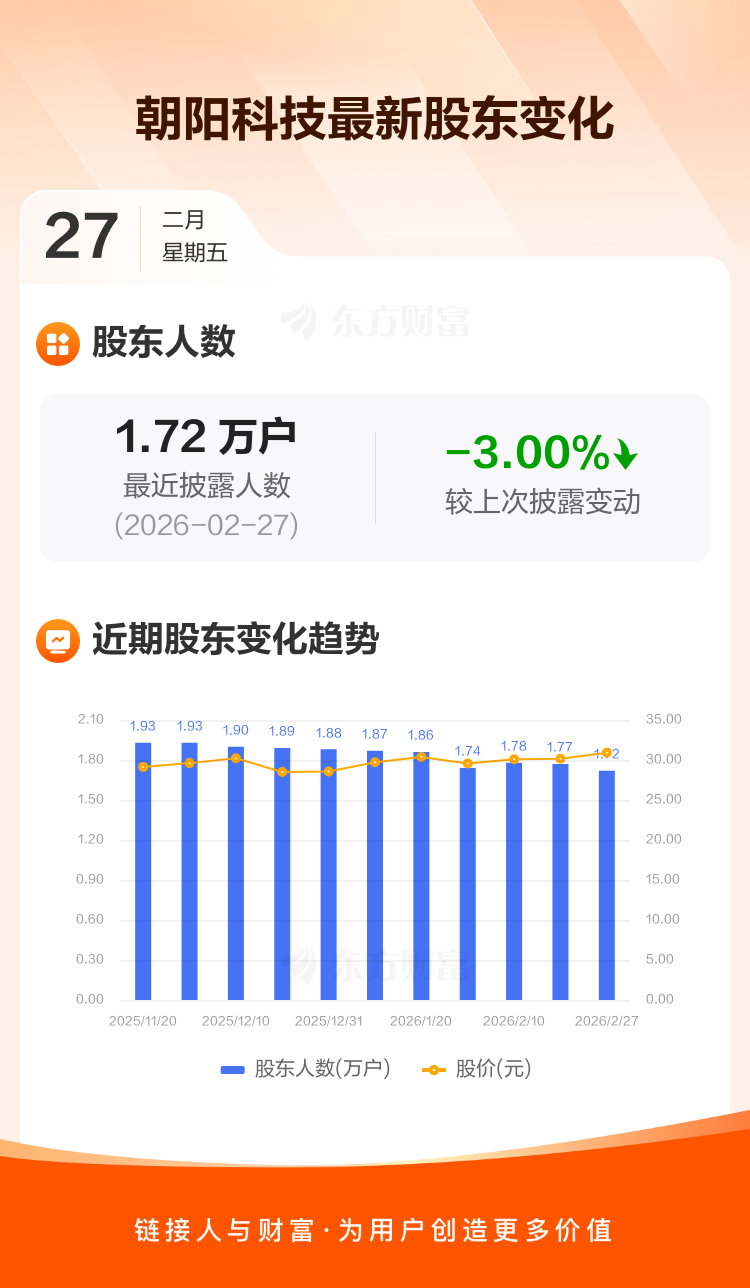 朝阳科技:截至2月27日最新股东户数1.72万户,较上期减少3.00%