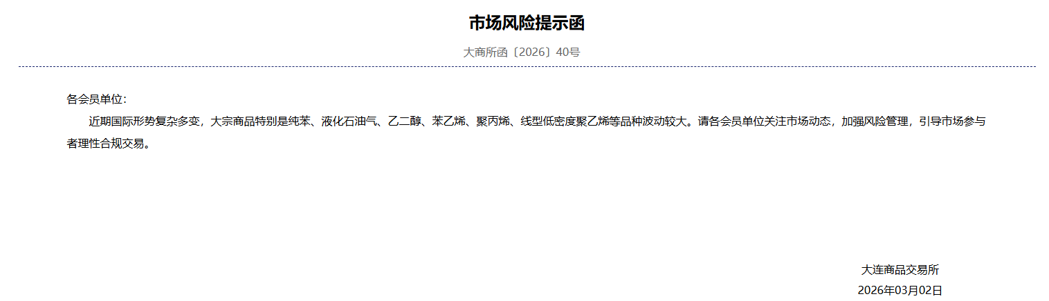 3月2日,大连商品交易所向各会员单位发布市场风险提示函称:近期国际形势复杂多变,大宗商品特别是纯苯、液化石油气、乙二醇、苯乙烯、聚丙烯、线型低密度聚乙烯等品种波动较大。请各会员单位关注市场动态,加强风险管理,引导市场参与者理性合规交易。