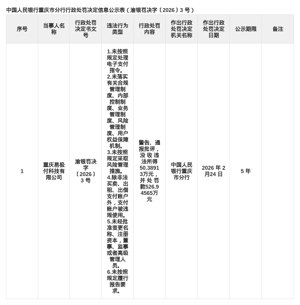 蓝鲸新闻3月2日讯,近日,中国人民银行重庆市分行发布了行政处罚决定信息公示表,剑指重庆易极付科技有限公司。