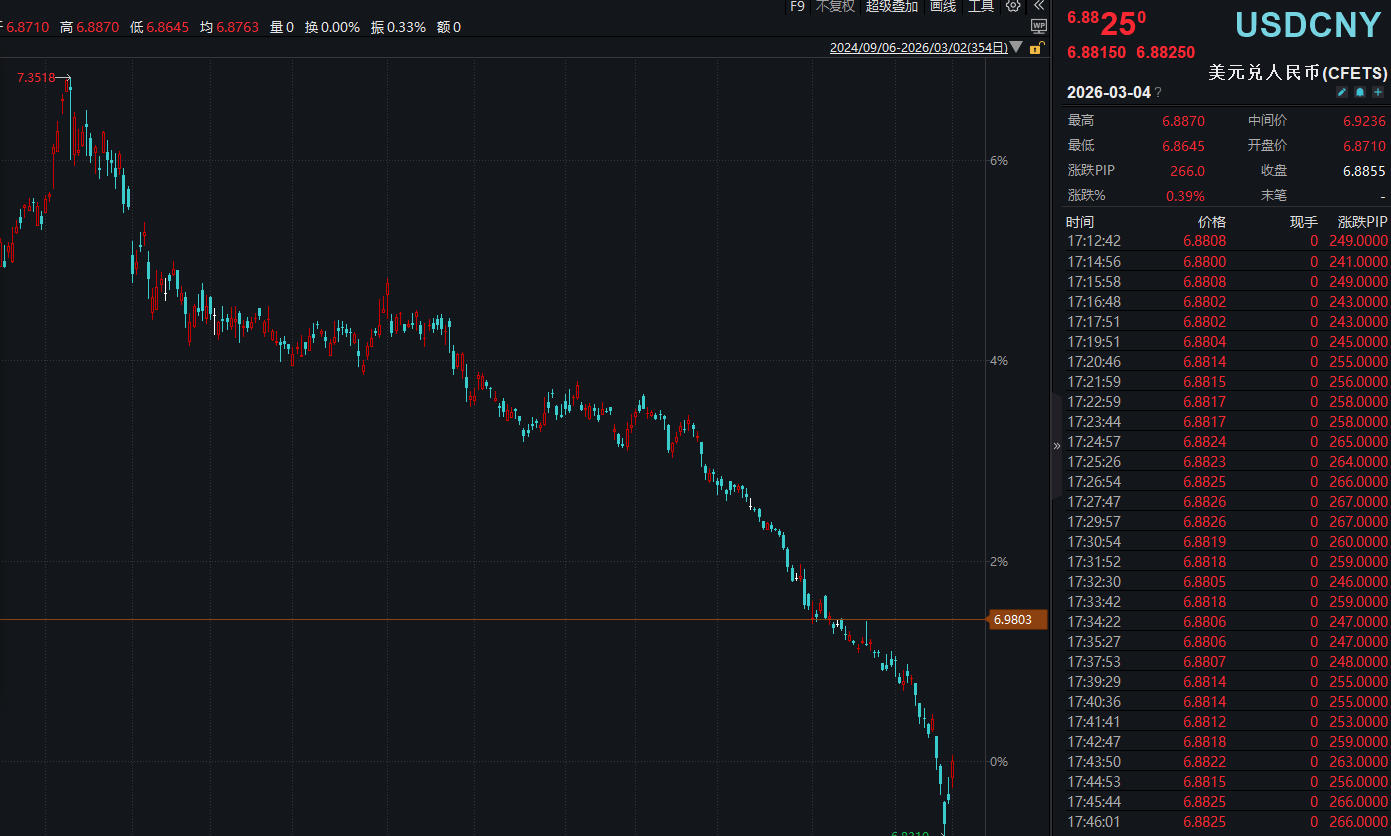 Wind数据显示,截至2月27日,美元兑人民币汇率跌至6.8559,近1年下跌5.71%,相比去年4月10日的高点7.3518更是跌幅达6.75%。